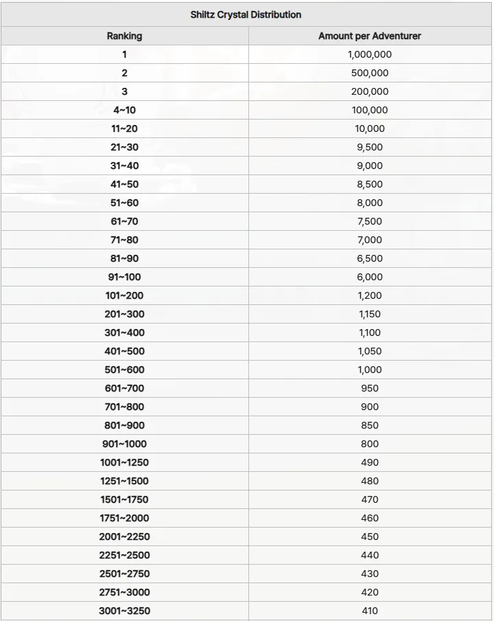 Os jogadores podem esperar receber os Cristais Shiltz conforme a seguinte tabela de distribuição.